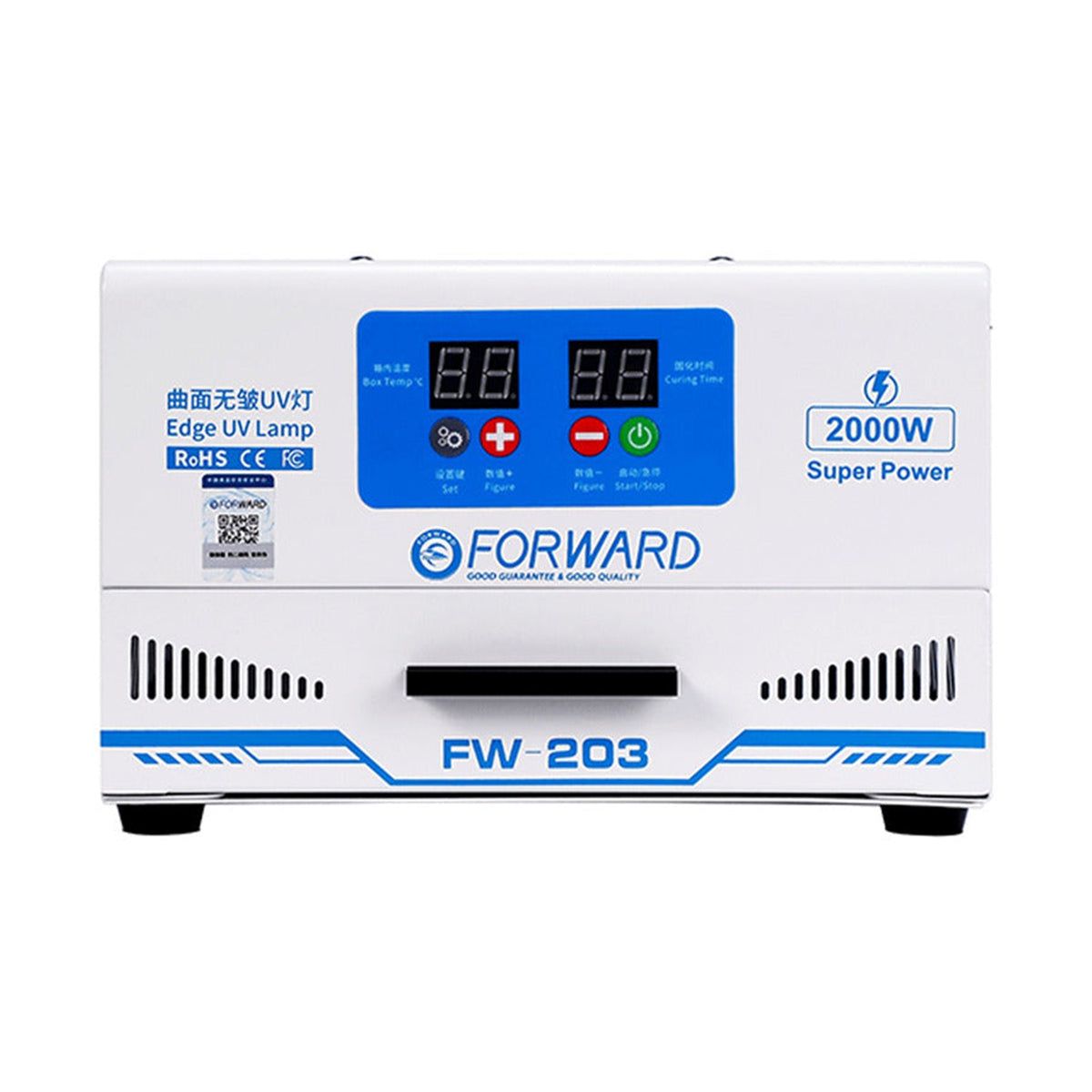 La Forward FW-203 es una lámpara de curado UV de alto rendimiento, diseñada con un área de exposición ampliada para cubrir perfectamente pantallas de tablets y iPads. Es la herramienta crítica para garantizar que las micas UV y el pegamento óptico en dispositivos grandes se adhieran de forma uniforme, especialmente en los bordes y paneles curvos.